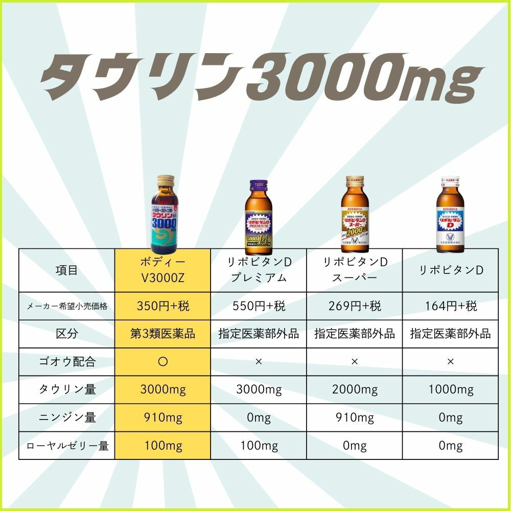 他の画像を見る タウリン3000mgに生薬配合の滋養強壮ドリンク 【第3類医薬品】 タウリン3000mg (ボディV3000Z)10本セット ゴオウ入りの滋養強壮ドリンク (0) 定価 ¥ 3,850 販売価格 ¥ 1,650 税込 お気に入りに登録する