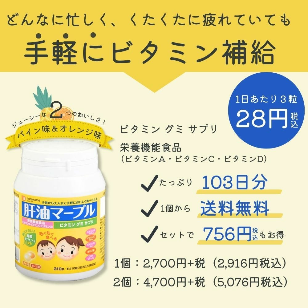 他の画像を見る 【栄養機能食品】ビタミンA・C・D 肝油マーブル [2個セット]【定期購入】 4.00 (1) 送料無料 定期販売 定期購入時の2回目以降の価格 ¥ 5,076 税込 お気に入りに登録する
