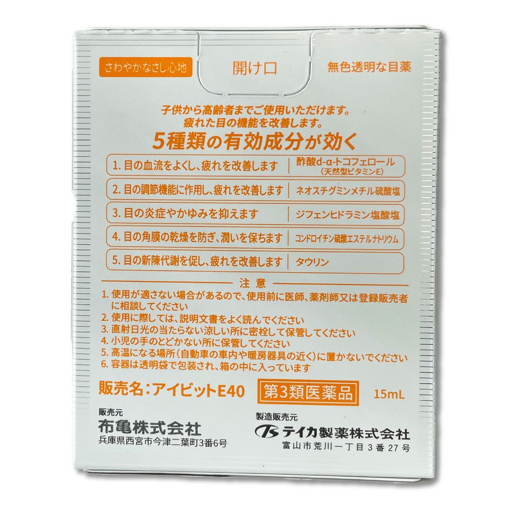 他の画像を見る 年齢や目の酷使による眼疲労、目のかすみにビタミンE配合の目薬 【第3類医薬品】【バラードE後継品」 目薬 アイビットE40 定価 ¥ 1,210 販売価格 ¥ 1,210 税込 (0) お気に入りに登録する