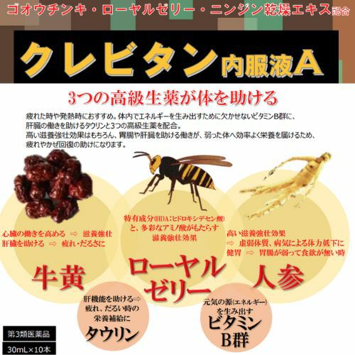 他の画像を見る 【2025メーカー都合により終売:代替商品はタウリン、イソビタンです】 クレビタン 内服液A(30ml×10本) 販売価格 ¥ 3,300 税込 (0) 申し訳ございませんが、只今在庫切れとなっており、ご注文いただけません。 お気に入りに登録する